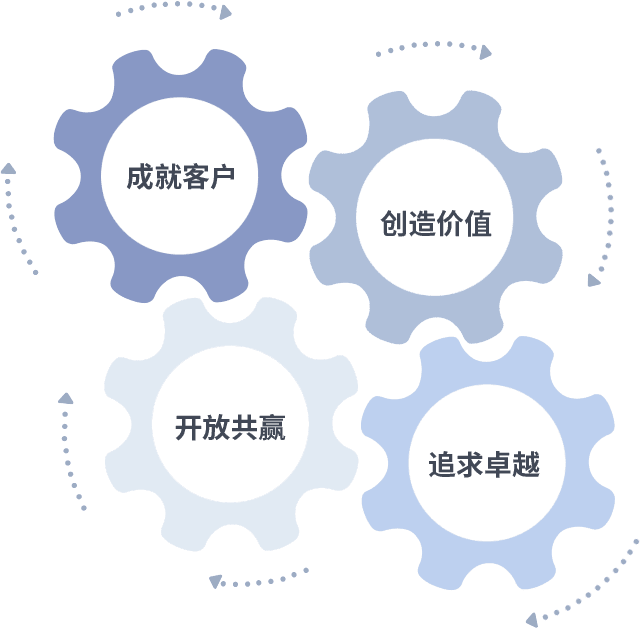 成就客户是一切决策的出发点,,,创造价值是衡量所有工作的标准,,追求卓越是我们做事做人的态度,,,开放共赢是我们的格局也是最终的结果。。。价值观的齿轮环环相扣,,推动着组织里的每个人不断向前。。。。